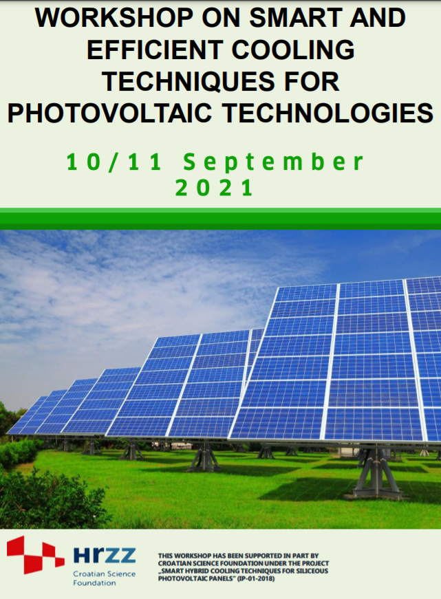 International workshop is focused on the recent advancements in the field of the smart and efficient cooling techniques for photovoltaics as part of the ongoing research project funded by Croatian Science Foundation. Different important topics would be discussed and that are related to the smart cooling systems of the silicon-based photovoltaics with main emphasis on techno-economic, environmental and modelling aspects. Several internationally recognized researchers and project collaborators will present and discuss specific topics linked with ongoing research on the project (Smart and hybrid cooling techniques for siliceous photovoltaic panels-IP-01-2018-2814.). (Download flyer)